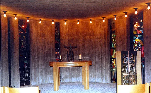 In der Kapelle, neben dem Eingangsbereich, stehen ein ovaler Altar aus Holz und darauf eine Figurengruppe „Kreuzigung“ sowie zwei Kerzenständer. Am Pult hängt ein Antependium mit den „sechs Werken der Barmherzigkeit“ (nach Matthäus 25). Bis auf den Altar stammen diese Werke von Hermann Pohl.