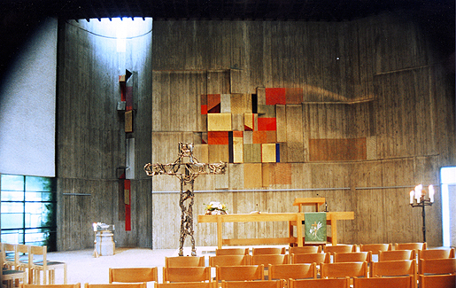 Inmitten der ausgebrannten Reste der Lutherkirche und in Verbindung mit dem Turm wird eine Notkirche errichtet.
